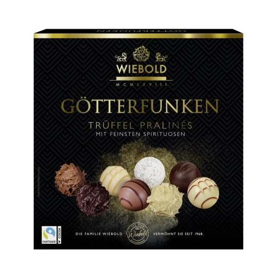 Die Götterfunken Trüffel Pralinés aus dem Hause Wiebold sind unsere klassische Edition. Die von Hand geigelten Trüffelpralinen zeigen die hohe Confiserie Kunst unserer Chocolatiers. Der Genießer findet in der Variante ohne Alkohol die Sorten Bourbon Vanille, Tartufo, Schwarze Johannisbeere auf Sahne, Mousse mit Nougat, Vanille auf Kaffee, Alster Trüffel, Karamell Schoko und Mandel wieder. Die Variante mit Alkohol bietet die Sorten Marc de Champagne, Rum, Cognac-Sahne, Orangenlikör, Tiramisu auf Mascarpone, Espresso-Brandy, Scotch Whisky und Eierlikör.